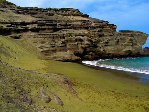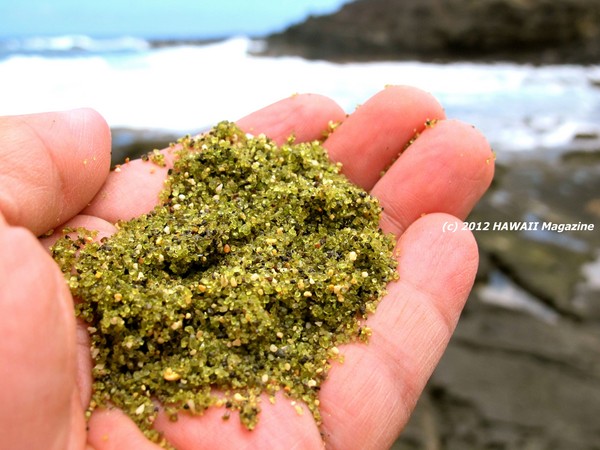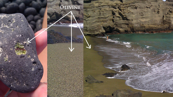因為夏威夷的岩層有豐富的橄欖石礦物,在經過岩層風化、海邊岬角侵蝕作用下,就形成了這珍貴的綠色沙灘。