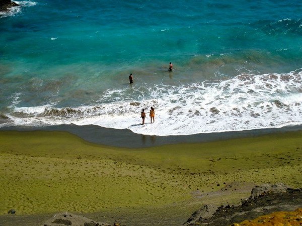 因為參雜了不少黑沙和黃沙,所以乍看顏色並不是這麼綠,而是淺淺淡淡的抹茶色。但當我們看看普通的黃沙灘、再回頭比較綠沙灘,就能感受出來綠沙灘的珍稀了!
